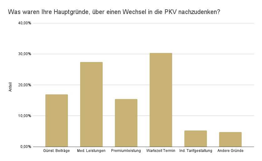 Die Gründe für solche Überlegungen sind klar erkennbar: Besonders die kürzeren Wartezeiten bei Fachärzten (30 %) und die Aussicht auf bessere medizinische Leistungen (27 %) machen die PKV attraktiv. Niedrigere Beiträge (17 %) oder Premiumleistungen wie Chefarztbehandlung (15 %) spielen eine untergeordnete Rolle.