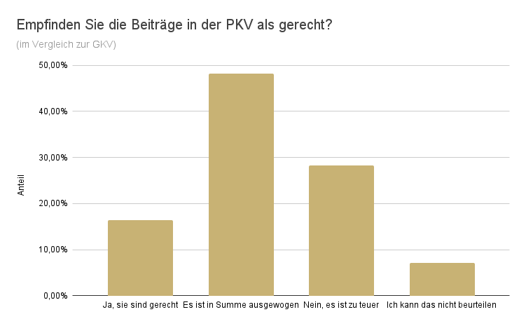 Bei der Wahrnehmung der Beitragsgerechtigkeit überwiegt ein differenziertes Urteil. 48 Prozent der Befragten empfinden die Beiträge im Vergleich zur GKV als ausgewogen, 16 Prozent sehen sie klar als gerecht verteilt. Dagegen halten 28 Prozent die Kosten für ungerecht hoch, während 7 Prozent sich kein Urteil zutrauen.