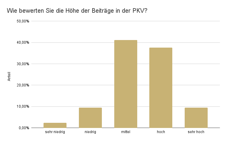 Die Kostenfrage bleibt auch für Privatversicherte ein zentrales Thema. 47 Prozent der Befragten empfinden ihre Beiträge als hoch oder sehr hoch, 41 Prozent halten sie für angemessen, während nur 12 Prozent sie als niedrig einschätzen.