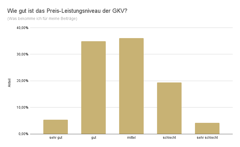 • In der GKV bewerten 40 Prozent das Beitragsniveau positiv, 36 Prozent als mittelmäßig und 24 Prozent negativ.