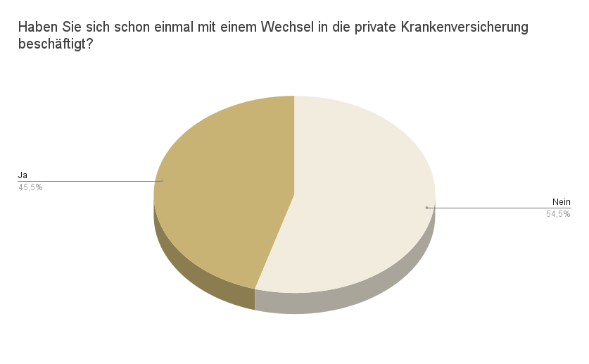 Beinahe die Hälfte (45 %) der gesetzlich Versicherten hat sich schon einmal mit einem Wechsel in die private Krankenversicherung befasst.