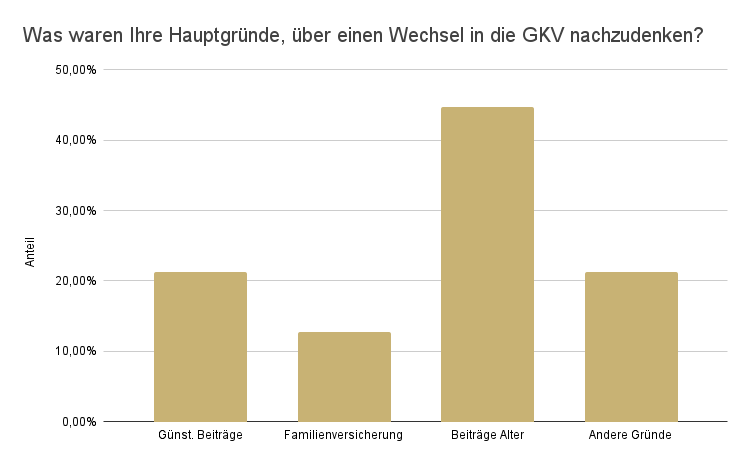 Die Hauptgründe liegen fast ausschließlich bei den Kosten. Besonders häufig genannt wurden die zu erwartenden Belastungen im Alter, die von 45 % der Befragten als zentrales Problem hervorgehoben wurden. Weitere Motive sind allgemein günstigere Beiträge oder die Möglichkeit der Familienversicherung für Kinder, die in der GKV inkludiert wäre.