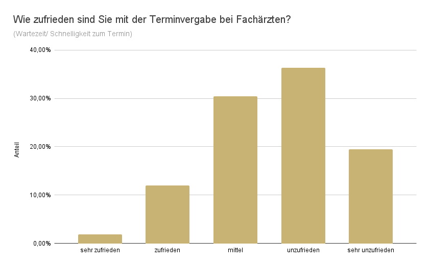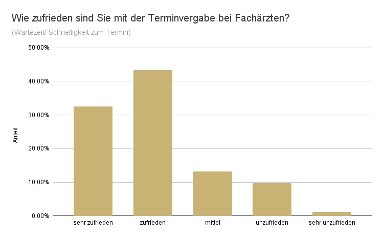 Die Terminvergabe bei Fachärzten wird überwiegend kritisch gesehen. 56 Prozent der Befragten bewerten ihre Wartezeiten negativ, 30 Prozent äußern sich neutral, und nur 14 Prozent sind zufrieden. Damit ist die Unzufriedenheit hier höher als in allen anderen abgefragten Bereichen.