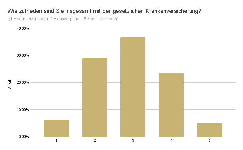 Die Gesamtzufriedenheit mit der GKV ist verhalten – aber auch nicht so schlecht, wie sie teilweise in Medien dargestellt wird. Rund 35 % der Befragten sind unzufrieden, etwa 28 % zufrieden. Die größte Gruppe – knapp 37 % – bewegt sich im neutralen Mittelfeld. Zufrieden oder sehr zufrieden sind rund 28%.