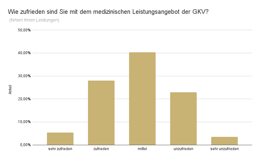 Auch beim medizinischen Leistungsangebot ergibt sich ein gemischtes Bild. 33 Prozent der Befragten sind zufrieden oder sehr zufrieden, 40 Prozent äußern sich neutral. Rund 26 Prozent sehen Defizite oder sind unzufrieden mit dem Leistungskatalog der GKV.